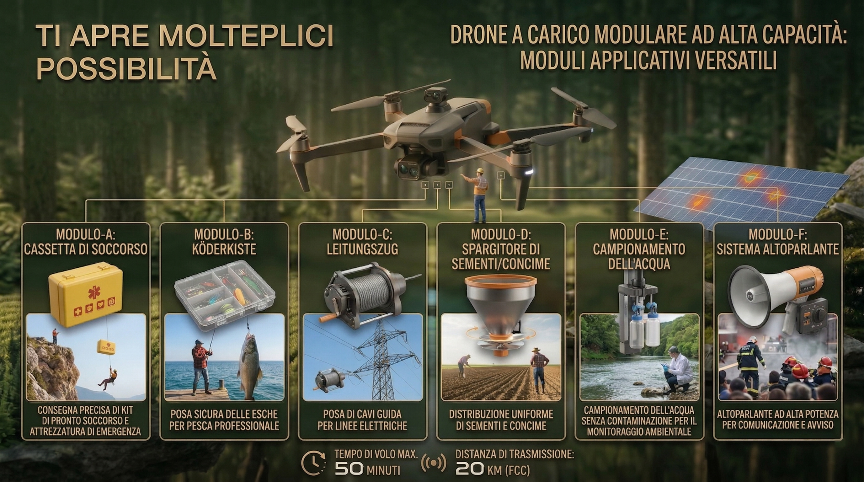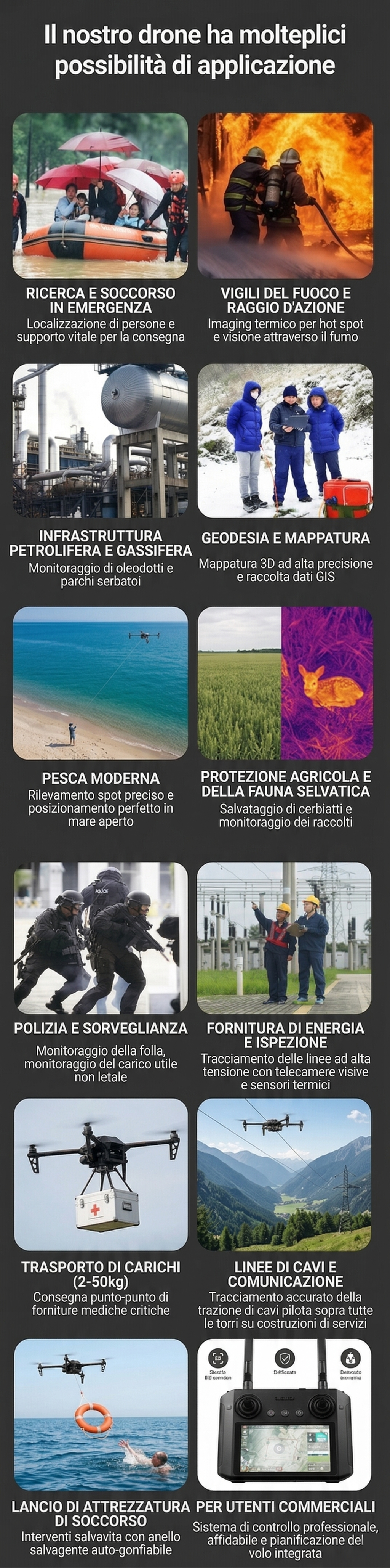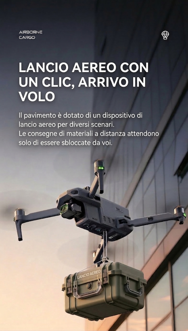Che si tratti di agricoltura, pesca, ispezioni, operazioni notturne, soccorso o rilascio a distanza — questo sistema è affidabile in ogni situazione. Potente, con posizionamento preciso e alta capacità di carico, rende semplici ed efficienti anche i compiti più complessi.Una soluzione per molteplici applicazioni, pronta all’uso e flessibile nell’impiego.