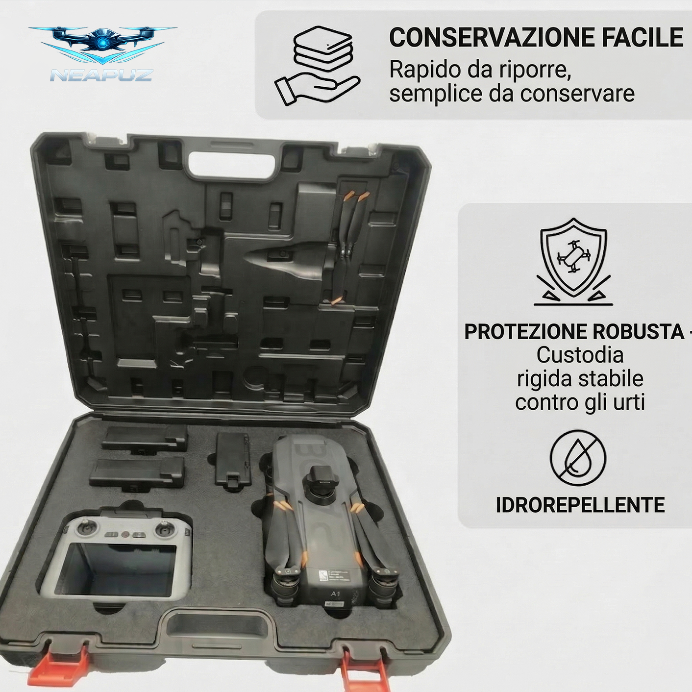 Imballato in una robusta valigetta rigida, offre una protezione completa. Resistente agli urti e alla pressione, con imbottitura interna su misura per un fissaggio sicuro e la riduzione delle vibrazioni — ideale per il trasporto e l’uso all’aperto.